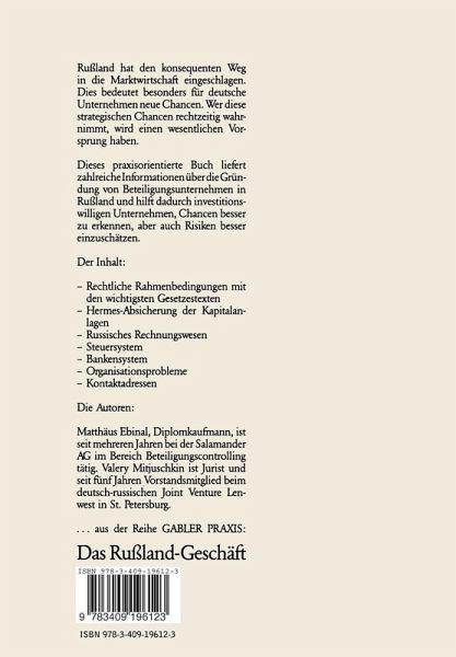 I. Allgemeine Informationen.- 1. Rußland auf dem schwierigen Weg zur Marktwirtschaft und Demokratie.- 2. Zur Geschichte der Joint Ventures in der Sowjetunion.- 3. Volkswirtschaft Rußlands und der GUS 1991.- 4. Joint Ventures in der gegenwärtigen Situation.- 5. Staatsaufbau der Russischen Föderation.- 6. Regierung und Gesetzgebung in der Übergangsphase.- II. Rechtliche Rahmenbedingungen.- 1. Gesetzliche Grundlagen für Investitionen.- 2. Unternehmensgesetz vom 25.12.1990.- 3. Gesetz über ausländische Investitionen in der RSFSR vom 4.7.1991.- 4. Bestimmung über Aktiengesellschaften vom 25.12.1990.- 5. Eigentumsgesetz vom 24.12.1990.- 6. Gesetz über die Privatisierung vom 3.7.1990.- III. Staatlicher Schutz von Auslandsinvestitionen.- 1. Hermes-Absicherung für Kapitalanlagen im Ausland.- 2. Deutsch-sowjetischer Investitionsförderungsvertrag vom 13.6.1989.- IV. Rechnungswesen in der UdSSR und in Rußland.- 1. Sozialistisches Rechnungswesen als Ausgangsbasis.- 2. Wirtschaftssystem als Determinante des Rechnungswesens.- 3. Darstellung des sowjetischen Rechnungswesens und Vergleich mit dem westlichen Rechnungswesen.- 4. Russische Buchführung anband von Beispielen.- 5. Deutsche EDV-Buchführung für russische Unternehmen: FIBU-C80.- V. Steuern, Geld und sonstiges.- 1. Steuersystem und Vermeidung der Doppelbesteuerung.- 2. Geld und Banken.- 3. Planung und Durchführung von Auslandsinvestitionen in Rußland.- 4. Auslandseinsatz des westlichen Personals und Visabeschaffung.- VI. Wichtige Kontaktadressen.- 1. Banken.- 2. Diplomatische Vertretungen und deutsche Schule.- 3. Regierungsstellen der Russischen Föderation.- 4. Vertretungen der Republiken der ehemaligen UdSSR.- 5. Russische Presse.- 6. Handelsvertretungen, Wirtschaftsprüfungsgesellschaften undConsultingunternehmen.- Stichwortverzeichnis.- Über die Autoren.