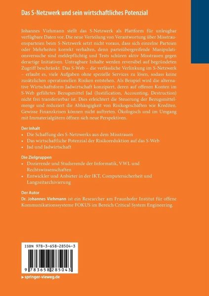 Johannes Viehmann stellt das S Netzwerk als Plattform für unleugbar verfügbare Daten vor. Die neue Verteilung von Verantwortung über Misstrauensparteien beim S-Netzwerk setzt nicht voraus, dass sich einzelne Parteien oder Mehrheiten korrekt verhalten, denn parteiübergreifende Manipulationsversuche sind meldepflichtig und Tests schüren aktiv Misstrauen gegen derartige Initiativen. Untragbare Inhalte werden reversibel auf begründeten Zugriff beschränkt. Das S Web - die verlässliche Verlinkung im S Netzwerk - erlaubt es, viele Aufgaben ohne spezielle Services zu lösen, sodass keine zusätzlichen operationellen Risiken entstehen. Als Beispiel wird die alternative Wirtschaftsform Jadwirtschaft konzipiert, deren auf offenen Konten im S-Web geführtes Bezugsmittel Jad (Justification, Accounting, Destruction) nicht frei transferierbar ist. Dies erleichtert die Steuerung der Bezugsmittelmenge und reduziert die Abhängigkeit von Risikogeschäften wie Krediten. Gewisse Finanzkrisen können nichtauftreten. Ökologisch und im Umgang mit Immaterialgütern öffnen sich neue Perspektiven.