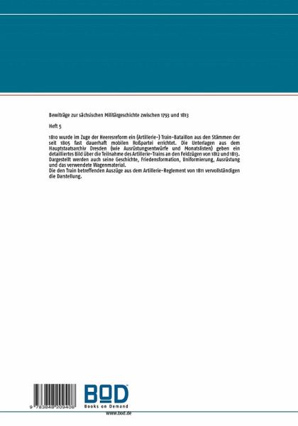 1810 wurde im Zuge der Heeresreform ein (Artillerie-) Train-Bataillon aus den Stämmen der seit 1805 fast dauerhaft mobilen Roßpartei errichtet. Die Unterlagen aus dem Hauptstaatsarchiv Dresden (wie Ausrüstungsentwürfe und Monatslisten) geben ein detailliertes Bild über die Teilnahme des Artillerie-Trains an den Feldzügen von 1812 und 1813. Dargestellt werden auch seine Geschichte, Friedensformation, Uniformierung, Ausrüstung und das verwendete Wagenmaterial. Die den Train betreffenden Auszüge aus dem Artillerie-Reglement von 1811 vervollständigen die Darstellung.