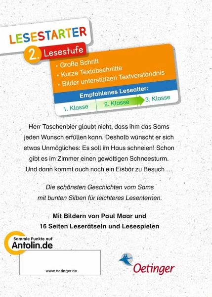 Farbige Silben, Bilder und knifflige Worträtsel machen dir das Lesenlernen noch leichter. Buchstaben in Blau und Orangerot zur besseren Unterscheidung für alle Kinder mit einer Rot-Grün-Schwäche. Die frechen Sams-Geschichten aus der Feder von Paul Maar motivieren kleine Leseratten, beim Lesenüben am Ball zu bleiben. Paul Maar wurde vielfach ausgezeichnet, u.a. mit dem Deutschen Jugendliteraturpreis.