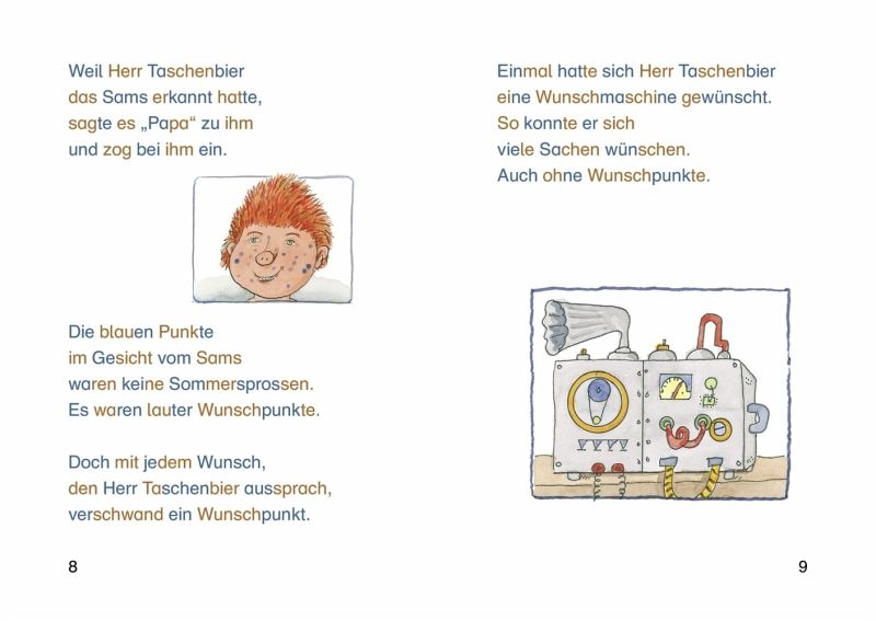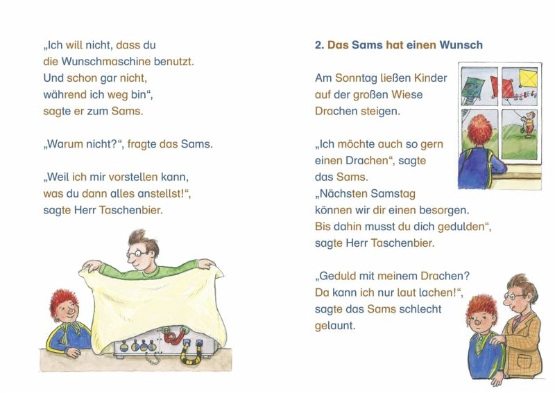 Ein neues Erstleseabenteuer mit Paul Maars frechem Sams: Als Papa Taschenbier auf der Arbeit ist, wünscht sich das Sams von der Wunschmaschine heimlich einen blauen Drachen. Den will es auf der Wiese vor dem Haus steigen lassen, wie es die Nachbarskinder tun. Doch auf einmal steht ein lebendiger Drache im Zimmer! Das sorgt für jede Menge Chaos und Drachenspaß, bis das Sams auf dem Hausdach landet. Die ungläubige Vermieterin Frau Rotkohl ruft die Feuerwehr, um das Sams vom Dach zu holen. Ob das gut geht?