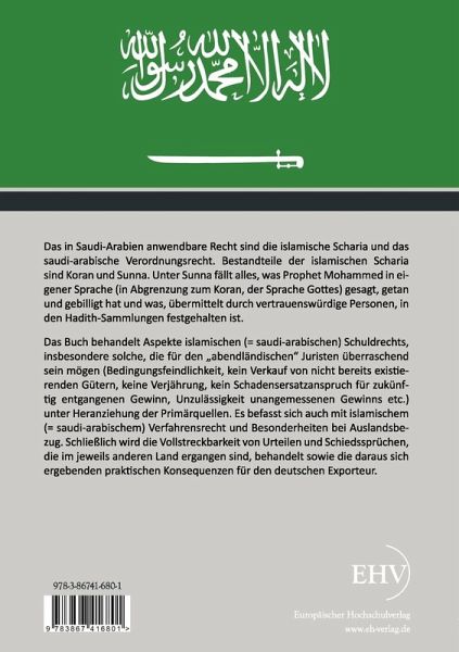 Das Buch behandelt Aspekte islamischen (= saudiarabischen) Schuldrechts, insbesondere solche, die für den "abendländischen" Juristen überraschend sein mögen (Bedingungsfeindlichkeit, kein Verkauf von nicht bereits existierenden Gütern, keine Verjährung, kein Schadensersatzanspruch für zukünftig entgangenen Gewinn, Unzulässigkeit unangemessenen Gewinns etc.) unter Heranziehung der Primärquellen. Das Buch befasst sich auch mit islamischem (= saudiarabischem) Verfahrensrecht und Besonderheiten bei Auslandsbezug. Ein weiteres Thema bildet die Vollstreckbarkeit von Urteilen und Schiedssprüchen, die im jeweils anderen Land ergangen sind. Ein Kapitel befasst sich mit den daraus ergebenden praktischen Konsequenzen für den deutschen Exporteur.