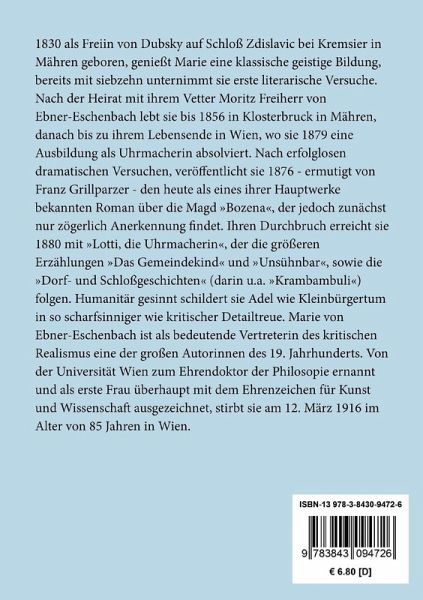 1830 als Freiin von Dubsky auf Schloß Zdislavic bei Kremsier in Mähren geboren, genießt Marie eine klassische geistige Bildung, bereits mit siebzehn unternimmt sie erste literarische Versuche. Nach der Heirat mit ihrem Vetter Moritz Freiherr von Ebner-Eschenbach lebt sie bis 1856 in Klosterbruck in Mähren, danach bis zu ihrem Lebensende in Wien, wo sie 1879 eine Ausbildung als Uhrmacherin absolviert. Nach erfolglosen dramatischen Versuchen, veröffentlicht sie 1876 - ermutigt von Franz Grillparzer - den heute als eines ihrer Hauptwerke bekannten Roman über die Magd "Bozena", der jedoch zunächst nur zögerlich Anerkennung findet. Ihren Durchbruch erreicht sie 1880 mit "Lotti, die Uhrmacherin", der die größeren Erzählungen "Das Gemeindekind" und "Unsühnbar", sowie die "Dorf- und Schloßgeschichten" (darin u.a. "Krambambuli") folgen. Humanitär gesinnt schildert sie Adel wie Kleinbürgertum in so scharfsinniger wie kritischer Detailtreue. Marie von Ebner-Eschenbach ist als bedeutende Vertreterin des kritischen Realismus eine der großen Autorinnen des 19. Jahrhunderts. Von der Universität Wien zum Ehrendoktor der Philosopie ernannt und als erste Frau überhaupt mit dem Ehrenzeichen für Kunst und Wissenschaft ausgezeichnet, stirbt sie am 12. März 1916 im Alter von 85 Jahren in Wien.