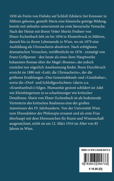 1830 als Freiin von Dubsky auf Schloß Zdislavic bei Kremsier in Mähren geboren, genießt Marie eine klassische geistige Bildung, bereits mit siebzehn unternimmt sie erste literarische Versuche. Nach der Heirat mit ihrem Vetter Moritz Freiherr von Ebner-Eschenbach lebt sie bis 1856 in Klosterbruck in Mähren, danach bis zu ihrem Lebensende in Wien, wo sie 1879 eine Ausbildung als Uhrmacherin absolviert. Nach erfolglosen dramatischen Versuchen, veröffentlicht sie 1876 - ermutigt von Franz Grillparzer - den heute als eines ihrer Hauptwerke bekannten Roman über die Magd "Bozena", der jedoch zunächst nur zögerlich Anerkennung findet. Ihren Durchbruch erreicht sie 1880 mit "Lotti, die Uhrmacherin", der die größeren Erzählungen "Das Gemeindekind" und "Unsühnbar", sowie die "Dorf- und Schloßgeschichten" (darin u.a. "Krambambuli") folgen. Humanitär gesinnt schildert sie Adel wie Kleinbürgertum in so scharfsinniger wie kritischer Detailtreue. Marie von Ebner-Eschenbach ist als bedeutende Vertreterin des kritischen Realismus eine der großen Autorinnen des 19. Jahrhunderts. Von der Universität Wien zum Ehrendoktor der Philosopie ernannt und als erste Frau überhaupt mit dem Ehrenzeichen für Kunst und Wissenschaft ausgezeichnet, stirbt sie am 12. März 1916 im Alter von 85 Jahren in Wien.