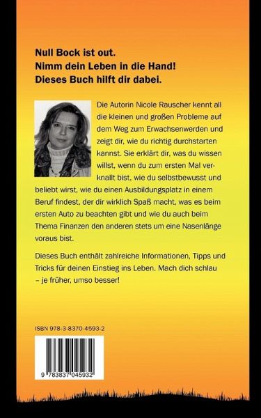 Null Bock ist out.Nimm dein Leben in die Hand!Dieses Buch hilft dir dabei.Die Autorin Nicole Rauscher kennt all die kleinen und großen Probleme auf dem Weg zum Erwachsenwerden und zeigt dir, wie du richtig durchstarten kannst. Sie erklärt dir, was du wissen willst, wenn du zum ersten Mal verknallt bist, wie du selbstbewusst und beliebt wirst, wie du einen Ausbildungsplatz in einem Beruf findest, der dir wirklich Spaß macht, was es beim ersten Auto zu beachten gibt und wie du auch beim Thema Finanzen den anderen stets um eine Nasenlänge voraus bist. Dieses Buch enthält zahlreiche Informationen, Tipps und Tricks für deinen Einstieg ins Leben. Mach dich schlau - je früher, umso besser!