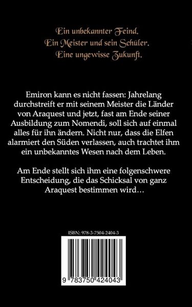 Emiron kann es nicht fassen: Jahrelang durchstreift er mit seinem Meister die Länder von Araquest und jetzt, fast am Ende seiner Ausbildung zum Nomendi, soll sich auf einmal alles für ihn ändern. Nicht nur, dass die Elfen alarmiert den Süden verlassen, auch trachtet ihm ein unbekanntes Wesen nach dem Leben.Am Ende stellt sich ihm eine folgenschwere Entscheidung, die das Schicksal von ganz Araquest bestimmen wird...