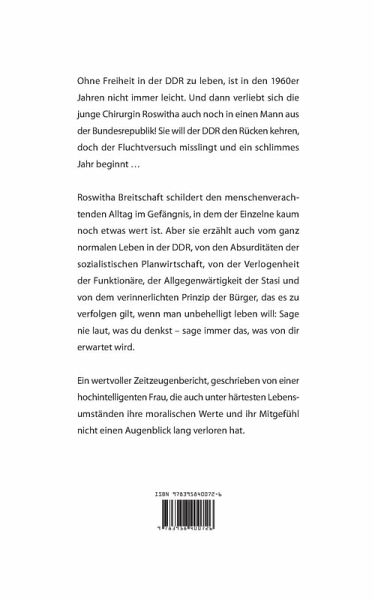 Ohne Freiheit in der DDR zu leben, ist in den 1960er Jahren nicht immer leicht. Und dann verliebt sich die junge Chirurgin Roswitha auch noch in einen Mann aus der Bundesrepublik! Sie will der DDR den Rücken kehren, doch der Fluchtversuch misslingt und ein schlimmes Jahr beginnt ...Roswitha Breitschaft schildert den menschenverachtenden Alltag im Gefängnis, in dem der Einzelne kaum noch etwas wert ist. Aber sie erzählt auch vom ganz normalen Leben in der DDR, von den Absurditäten der sozialistischen Planwirtschaft, von der Verlogenheit der Funktionäre, der Allgegenwärtigkeit der Stasi und von dem verinnerlichten Prinzip der Bürger, das es zu verfolgen gilt, wenn man unbehelligt leben will: Sage nie laut, was du denkst - sage immer das, was von dir erwartet wird.Ein wertvoller Zeitzeugenbericht, geschrieben von einer hochintelligenten Frau, die auch unter härtesten Lebensumständen ihre moralischen Werte und ihr Mitgefühl nicht einen Augenblick lang verloren hat.