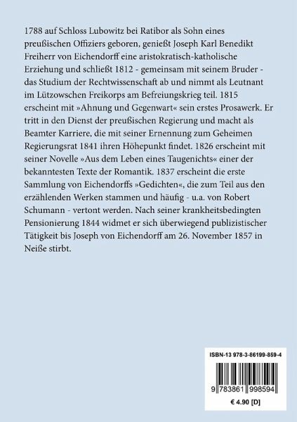 1788 auf Schloss Lubowitz bei Ratibor als Sohn eines preußischen Offiziers geboren, genießt Joseph Karl Benedikt Freiherr von Eichendorff eine aristokratisch-katholische Erziehung und schließt 1812 - gemeinsam mit seinem Bruder - das Studium der Rechtwissenschaft ab und nimmt als Leutnant im Lützowschen Freikorps am Befreiungskrieg teil. 1815 erscheint mit "Ahnung und Gegenwart" sein erstes Prosawerk. Er tritt in den Dienst der preußischen Regierung und macht als Beamter Karriere, die mit seiner Ernennung zum Geheimen Regierungsrat 1841 ihren Höhepunkt findet. 1826 erscheint mit seiner Novelle "Aus dem Leben eines Taugenichts" einer der bekanntesten Texte der Romantik. 1837 erscheint die erste Sammlung von Eichendorffs "Gedichten", die zum Teil aus den erzählenden Werken stammen und häufig - u.a. von Robert Schumann - vertont werden. Nach seiner krankheitsbedingten Pensionierung 1844 widmet er sich überwiegend publizistischer Tätigkeit bis Joseph von Eichendorff am 26. November 1857 in Neiße stirbt.