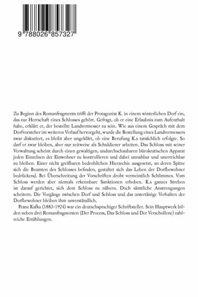 Zu Beginn des Romanfragments trifft der Protagonist K. in einem winterlichen Dorf ein, das zur Herrschaft eines Schlosses gehört. Gefragt, ob er eine Erlaubnis zum Aufenthalt habe, erklärt er, der bestellte Landvermesser zu sein. Wie aus einem Gespräch mit dem Dorfvorsteher im weiteren Verlauf hervorgeht, wurde die Bestellung eines Landvermessers zwar diskutiert, es bleibt aber ungeklärt, ob eine Berufung K.s tatsächlich erfolgte. So darf er zwar bleiben, aber nur zeitweise als Schuldiener arbeiten. Das Schloss mit seiner Verwaltung scheint durch einen gewaltigen, undurchschaubaren bürokratischen Apparat jeden Einzelnen der Einwohner zu kontrollieren und dabei unnahbar und unerreichbar zu bleiben. Einer nicht greifbaren bedrohlichen Hierarchie ausgesetzt, an deren Spitze sich die Beamten des Schlosses befinden, gestaltet sich das Leben der Dorfbewohner bedrückend. Bei Überschreitung der Vorschriften droht vermeintlich Schlimmes. Vom Schloss werden aber niemals erkennbare Sanktionen erhoben. K.s ganzes Streben ist darauf gerichtet, sich dem Schloss zu nähern. Doch sämtliche Anstrengungen scheitern. Die Vorgänge zwischen Dorf und Schloss und das untertänige Verhalten der Dorfbewohner bleiben ihm unverständlich. Franz Kafka (1883-1924) war ein deutschsprachiger Schriftsteller. Sein Hauptwerk bilden neben drei Romanfragmenten (Der Process, Das Schloss und Der Verschollene) zahlreiche Erzählungen.