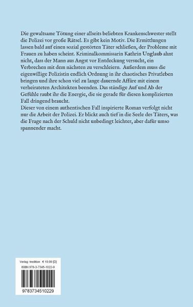 Im Brunnen eines leerstehenden alten Hauses wird die halb verbrannte Leiche einer jungen Frau gefunden. Schnell bringen die gerichtsmedizinischen Untersuchungen Gewissheit. Es handelt sich um die seit vier Wochen vermisste Krankenschwester Eva Zimmermann. Sie hatte eines Tages nach ihrem Frühdienst die Klinik verlassen, um ihre beiden Söhne aus dem Kindergarten abzuholen. Dort ist sie nie angekommen. Sie wurde erwürgt, in den Brunnenschacht gelegt, mit Benzin übergossen und angezündet. Merkwürdige Haarrisse an ihren Unterschenkeln deuten darauf hin, dass sie vorher offenbar mit leichter Geschwindigkeit von einem Auto angefahren wurde.Kriminalkommissarin Kathrin Unglaub und ihre Kollegen der Mordkommission ermitteln in diesem Fall. Sie finden heraus, dass Eva Zimmermann nicht die erste war, die von einem unscheinbaren Mann unter merkwürdigen Umständen angefahren wurde. Ist die Situation diesmal außer Kontrolle geraten? Was ist das für ein Mensch, der auf diese Weise Kontakt zu Frauen sucht?Kathrin Unglaub ahnt nicht, dass der Täter aus Angst vor Entdeckung versucht, ein Verbrechen mit dem nächsten zu verschleiern. Außerdem muss die eigenwillige Polizistin endlich Ordnung in ihr chaotisches Privatleben bringen und ihre schon viel zu lange dauernde Affäre mit einem verheirateten Architekten beenden. Das ständige Auf und Ab der Gefühle raubt ihr die Energie, die sie gerade für diesen komplizierten Fall dringend braucht. Dieser von einem authentischen Fall inspirierte Roman verfolgt nicht nur die Ermittlungen der Polizei. Er blickt auch tief in die Seele des Täters, was die Frage nach der Schuld nicht unbedingt leichter, aber dafür umso spannender macht.