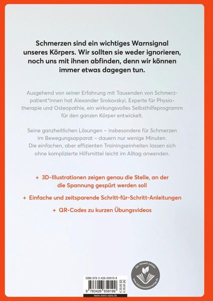 Zudem räumt Alexander Srokovskyi mit falschen Annahmen und Vorurteilen zur Gesundheit auf und erklärt auf leicht verständliche Weise und anhand vieler Patient_innenbeispiele, wie wir in Zukunft gut mit Schmerzen umgehen können. Haben wir bereits Schmerzen, zeigt er, wie sie sich durch einfache Übungen lindern lassen. Und auch wenn wir uns gut fühlen, können wir in diesem Buch viel darüber lernen, wie wir schmerzfrei bleiben. Alexander Srokovskyi zeigt, wie jede_r seine Lebensqualität verbessern kann - unabhängig vom Alter oder dem aktuellen Gesundheitszustand.