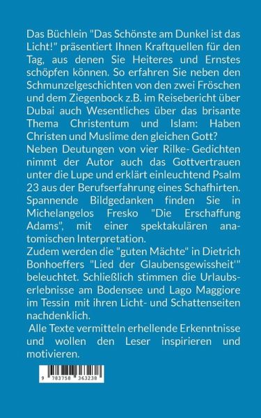 Das Büchlein "Das Schönste am Dunkel ist das Licht!" präsentiert Ihnen Kraftquellen für den Tag, aus denen Sie Heiteres und Ernstes schöpfen können. So erfahren Sie neben den Schmunzelgeschichten von den zwei Fröschen und dem Ziegenbock z.B. im Reisebericht über Dubai auch Wesentliches über das brisante Thema Christentum und Islam: Haben Christen und Muslime den gleichen Gott?Neben Deutungen von vier Rilke-Gedichten nimmt der Autor auch das Gottvertrauen unter die Lupe und erklärt einleuchtend Psalm 23 aus der Berufserfahrung eines Schafhirten. Spannende Bildgedanken finden Sie in Michelangelos Fresko "Die Erschaffung Adams", mit einer spektakulären anatomischen Interpretation.Zudem werden die "guten Mächte" in Dietrich Bonhoeffers "Lied der Glaubensgewissheit'" beleuchtet. Schließlich stimmen die Urlaubserlebnisse am Bodensee und Lago Maggiore/Tessin - mit ihren Licht- und Schattenseiten - nachdenklich. Alle Texte vermitteln erhellende Erkenntnisse und wollen den Leser inspirieren und motivieren.