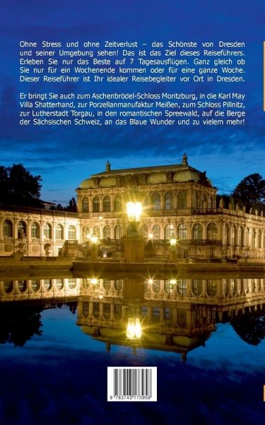 1 Euro geht an den Wiederaufbau der Nikolaikirche in Torgau. In der Nikolaikirche fand die weltweit erste lutherisch-evangelische Taufe und der erste lutherisch-evangelische Gottesdienst statt.Erleben Sie nur das Beste auf 7 Tagesausflügen. Ohne Stress und ohne Zeitverlust - das Schönste von Dresden und seiner Umgebung sehen! Das ist das Ziel dieses Reiseführers. Ganz gleich ob Sie nur für ein Wochenende kommen oder für eine ganze Woche. Dieser Reiseführer ist Ihr idealer Reisebegleiter vor Ort in Dresden. Übersichtliche Stadtkarten führen Sie in allen Orten sicher zu den Sehenswürdigkeiten!So bringt er Sie auch zum Aschenbrödel-Schloss Moritzburg, in die Karl May Villa Shatterhand, zur Porzellanmanufaktur Meißen, zum Schloss Pillnitz, zur Lutherstadt Torgau, in den romantischen Spreewald, auf die Berge der Sächsischen Schweiz, an das Blaue Wunder und zu vielem mehr!