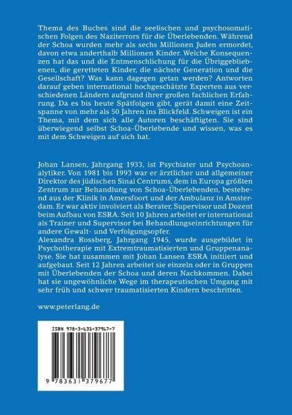 Aus dem Inhalt: Leo Eitinger: Und die Welt hat geschwiegen! - Haim Dasberg: Warum geschwiegen wurde - Spätfolgen in Israel - David de Levita: Erinnern und Gedenken - David de Levita: Über das Schweigen - Dierk Juelich: Erlebtes und ererbtes Trauma - Alexandra Rossberg: Die Zeit heilt die Wunden nicht - Inge Michael: lebenslänglich - Alexandra Rossberg: Der halbe Stern - Robert Krell: Die nicht anerkannten und verborgenen Überlebenden der Schoa: Kinder des Holocaust - Robert Krell: Reflexionen eines Child Survivors und Psychiaters - Johan Lansen: Was ist ein Trauma - Han Groen-Prakken: Trauma und Entwicklungsinterferenz - Johan Lansen: Spätfolgen bei Überlebenden des Naziterrors und anderen Verfolgten der Jahre 1933-1945 - Chris Barneveld: Behandlung von Verfolgten im Seniorenalter - Johan Lansen: Verlassenheit: Folgen und Behandlung - Johan Lansen: Psychoanalyse und Verfolgungstrauma - Haim Dasberg: Erzähltherapie in Gruppen alternder Child Survivors - David de Levita: Die Adoleszenz der Zweiten Generation - Johan Lansen: Die Zweite Generation: Forschung, Theorien und Schlussfolgerungen in den Niederlanden - Johan Lansen: Gefühle und Belastungen in der Arbeit mit Schoa-Opfern und anderen Traumatisierten - David de Levita: Einige Erfahrungen mit der Begutachtung im Rahmen der Entschädigung von Verfolgten in den Niederlanden - Reinhart Lempp: Lernen von den Überlebenden - Reinhart Lempp: Die Einschätzung einer verfolgungsbedingten Minderung der Erwerbsfähigkeit bei psychischen Störungen nach Verfolgung im Kindes- und Jugendalter - Haim Dasberg: Psychiatrische Expertise - Haim Dasberg: Paradox - Louis Tas: Mit-teilen - Robert Krell: Das Geheimnis und die Würde der jüngsten Child Survivors - Rachel Maier: Ein Buch kommt, es kommt ein Buch.