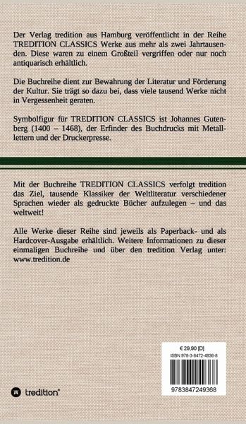 Diese Hardcover-Ausgabe ist Teil der TREDITION CLASSICS. Der Verlag tredition aus Hamburg veröffentlicht in der Buchreihe TREDITION CLASSICS Werke aus mehr als zwei Jahrtausenden. Diese waren zu einem Großteil vergriffen oder nur noch antiquarisch erhältlich. Mit TREDITION CLASSICS verfolgt tredition das Ziel, tausende Klassiker der Weltliteratur verschiedener Sprachen wieder als gedruckte Bücher zu verlegen und das weltweit! Die Buchreihe dient zur Bewahrung der Literatur und Förderung der Kultur. Sie trägt so dazu bei, dass viele tausend Werke nicht in Vergessenheit geraten.