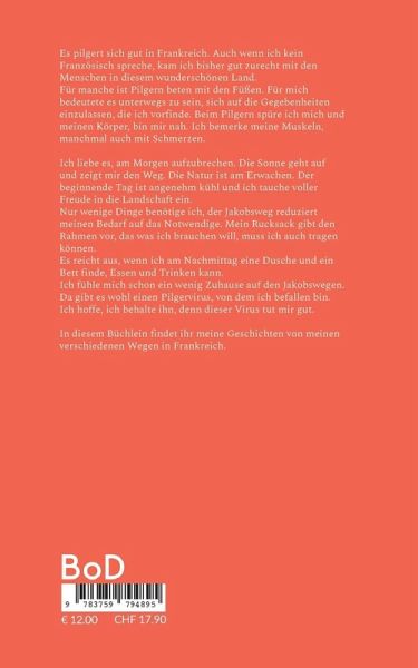 Es pilgert sich gut in Frankreich. Auch wenn ich kein Französisch spreche, kam ich bisher gut zurecht mit den Menschen in diesem wunderschönen Land. Für manche ist Pilgern beten mit den Füßen. Für mich bedeutete es unterwegs zu sein, sich auf die Gegebenheiten einzulassen, die ich vorfinde. Beim Pilgern spüre ich mich und meinen Körper, bin mir nah. Ich bemerke meine Muskeln, manchmal auch mit Schmerzen. Ich liebe es, am Morgen aufzubrechen. Die Sonne geht auf und zeigt mir den Weg. Die Natur ist am Erwachen. Der beginnende Tag ist angenehm kühl und ich tauche voller Freude in die Landschaft ein. Nur wenige Dinge benötige ich, der Jakobsweg reduziert meinen Bedarf auf das Notwendige. Mein Rucksack gibt den Rahmen vor, das was ich brauchen will, muss ich auch tragen können. Es reicht aus, wenn ich am Nachmittag eine Dusche und ein Bett finde, Essen und Trinken kann. Ich fühle mich schon ein wenig Zuhause auf den Jakobswegen. Da gibt es wohl einen Pilgervirus, von dem ich befallen bin. Ich hoffe, ich behalte ihn, denn dieser Virus tut mir gut. In diesem Büchlein findet ihr meine Geschichten von meinen verschiedenen Wegen in Frankreich.