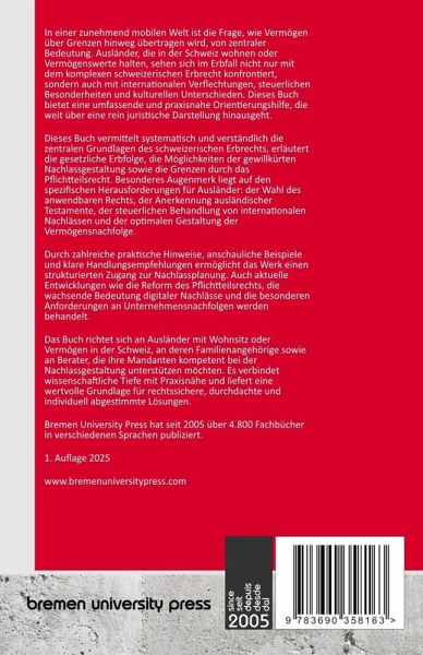 In einer zunehmend mobilen Welt ist die Frage, wie Vermögen über Grenzen hinweg übertragen wird, von zentraler Bedeutung. Ausländer, die in der Schweiz wohnen oder Vermögenswerte halten, sehen sich im Erbfall nicht nur mit dem komplexen schweizerischen Erbrecht konfrontiert, sondern auch mit internationalen Verflechtungen, steuerlichen Besonderheiten und kulturellen Unterschieden. Dieses Buch bietet eine umfassende und praxisnahe Orientierungshilfe, die weit über eine rein juristische Darstellung hinausgeht. Dieses Buch vermittelt systematisch und verständlich die zentralen Grundlagen des schweizerischen Erbrechts, erläutert die gesetzliche Erbfolge, die Möglichkeiten der gewillkürten Nachlassgestaltung sowie die Grenzen durch das Pflichtteilsrecht. Besonderes Augenmerk liegt auf den spezifischen Herausforderungen für Ausländer: der Wahl des anwendbaren Rechts, der Anerkennung ausländischer Testamente, der steuerlichen Behandlung von internationalen Nachlässen und der optimalen Gestaltung der Vermögensnachfolge. Durch zahlreiche praktische Hinweise, anschauliche Beispiele und klare Handlungsempfehlungen ermöglicht das Werk einen strukturierten Zugang zur Nachlassplanung. Auch aktuelle Entwicklungen wie die Reform des Pflichtteilsrechts, die wachsende Bedeutung digitaler Nachlässe und die besonderen Anforderungen an Unternehmensnachfolgen werden behandelt. Das Buch richtet sich an Ausländer mit Wohnsitz oder Vermögen in der Schweiz, an deren Familienangehörige sowie an Berater, die ihre Mandanten kompetent bei der Nachlassgestaltung unterstützen möchten. Es verbindet wissenschaftliche Tiefe mit Praxisnähe und liefert eine wertvolle Grundlage für rechtssichere, durchdachte und individuell abgestimmte Lösungen. Bremen University Press hat seit 2005 über 4.800 Fachbücher in verschiedenen Sprachen publiziert. 1. Auflage 2025