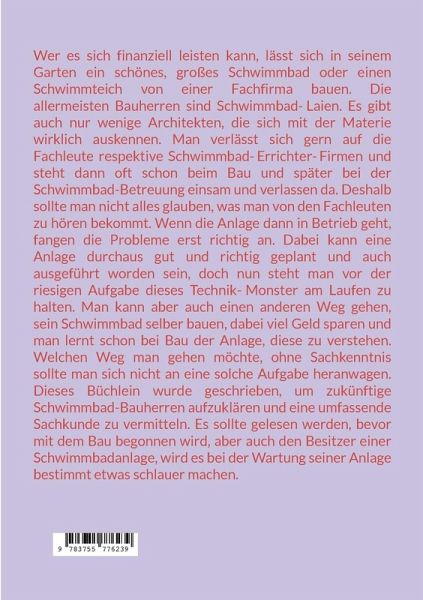 Wer es sich finanziell leisten kann, lässt sich in seinem Garten ein schönes, großes Schwimmbad oder einen Schwimmteich von einer Fachfirma bauen. Die allermeisten Bauherren sind Schwimmbad-Laien. Es gibt auch nur wenige Architekten, die sich mit der Materie wirklich auskennen. Man verlässt sich gern auf die Fachleute respektive Schwimmbad-Errichter-Firmen und steht dann oft schon beim Bau und später bei der Schwimmbad-Betreuung einsam und verlassen da. Deshalb sollte man nicht alles glauben, was man von den Fachleuten zu hören bekommt. Wenn die Anlage dann in Betrieb geht, fangen die Probleme erst richtig an. Dabei kann eine Anlage durchaus gut und richtig geplant und auch ausgeführt worden sein, doch nun steht man vor der riesigen Aufgabe dieses Technik-Monster am Laufen zu halten. Man kann aber auch einen anderen Weg gehen, sein Schwimmbad selber bauen, dabei viel Geld sparen und man lernt schon bei Bau der Anlage, diese zu verstehen. Welchen Weg man gehen möchte, ohne Sachkenntnis sollte man sich nicht an eine solche Aufgabe heranwagen. Dieses Büchlein wurde geschrieben, um zukünftige Schwimmbad-Bauherren aufzuklären und eine umfassende Sachkunde zu vermitteln. Es sollte gelesen werden, bevor mit dem Bau begonnen wird, aber auch den Besitzer einer Schwimmbadanlage, wird es bei der Wartung seiner Anlage bestimmt etwas schlauer machen.