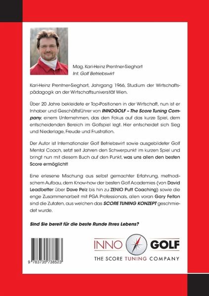 Karl-Heinz Prentner-Sieghart, Jahrgang 1966, Studium der Wirtschaftspädagogik an der Wirtschaftsuniversität Wien. Über 20 Jahre bekleidete er Top Positionen in der Wirtschaft, nun ist er Inhaber und Geschäftsführer von INNOGOLF - The Score Tuning Company, einem Unternehmen, dass den Fokus auf das kurze Spiel, dem entscheidenden Bereich im Golfspiel legt. Hier entscheidet sich Sieg und Niederlage, Freude und Frustration. Der Autor ist Internationaler Golf Betriebswirt sowie ausgebildeter Golf Mental Coach, setzt seit Jahren den Schwerpunkt im kurzen Spiel und bringt nun mit diesem Buch auf den Punkt, was uns allen den besten Score ermöglicht! Eine erlesene Mischung aus selbst gemachter Erfahrung, methodischem Aufbau, dem Know How der besten Golf Academies, von David Leadbetter über Dave Pelz bis ZENIO Putt Coaching sowie die enge Zusammenarbeit mit PGA Professionals, allen voran GARY FELTON sind die Zutaten, aus welchen das SCORE TUNING KONZEPT geschmiedet wurde. Sind Sie bereit für die beste Runde Ihres Lebens?