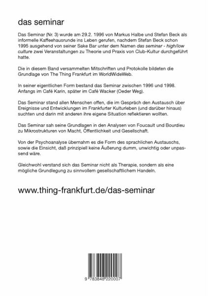 Das Seminar. Kaffeehausrunde im Café Karin, Frankfurt 1996. Gespräche zu Kunst und Subkultur in Frankfurt. Dokumentation von 13 Sitzungen, sowie weiterführende Materialien zur Arbeit des Seminars.
