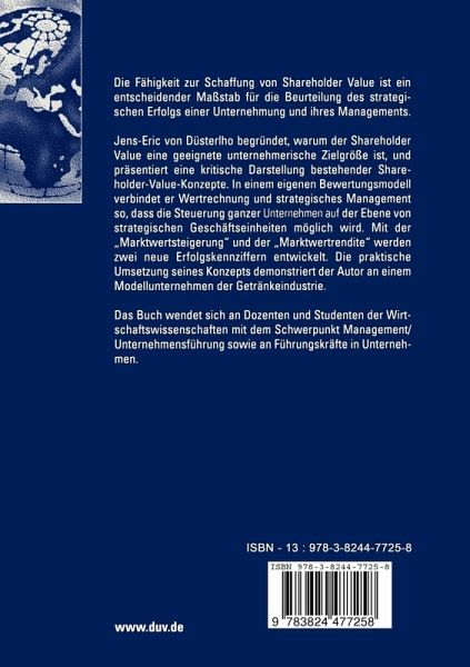 Jens-Eric von Düsterlho begründet, warum der Shareholder Value eine geeignete unternehmerische Zielgröße ist, und präsentiert eine kritische Darstellung bestehender Shareholder-Value-Konzepte. In einem eigenen Bewertungsmodell verbindet er Wertrechnung und strategisches Management so, dass die Steuerung ganzer Unternehmen auf der Ebene von strategischen Geschäftseinheiten möglich wird. Mit der "Marktwertsteigerung" und der "Marktwertrendite" werden zwei neue Erfolgskennziffern entwickelt. Die praktische Umsetzung seines Konzepts demonstriert er an einem Modellunternehmen der Getränkeindustrie.