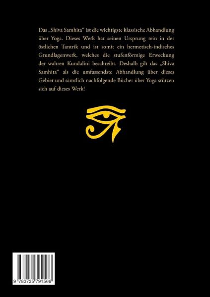 Das "Shiva Samhita" ist die wichtigste klassische Abhandlungen über den Yoga. Dieses Werk hat seinen Ursprung rein in der östlichen Tantrik und ist somit ein hermetisch-indisches Grundlagenwerk, welches die stufenförmige Erweckung der wahren Kundalini beschreibt. Deshalb gilt das "Shiva Samhita" als die umfassendste Abhandlung über dieses Gebiet und sämtlich nachfolgende Bücher über Yoga stützen sich auf dieses Werk!Inhaltsangabe:I. KapitelDie Existenz des EinenMeinungsverschiedenheitenYoga, die einzige Methode der BefreiungRitualismusWeisheitDer GeistYoga und MayaDefinition des ParamhamsaEmanation oder EntwicklungAbsorption oder InvolutionKarma kleidet des Jiva mit dem KörperII. KapitelDer MikrokosmosNervenzentrenNervenBeckenbereichBauchregionDer JivatmaIII. KapitelDie Yoga-Praxis - die VayusDer Guru.Der AdhikariDer OrtDer PranayamaDinge, auf die man verzichten mussDie MittelDie erste StufeDie zweite und dritte StufeVayu-SiddhasErhöhung der DauerSiddhas oder VollkommenheitenGhata AvastaParichayaNishpattiDie KörperhaltungenSiddhasanaPadmasanaUgrasanaSvastikasanaIV. KapitelYoni-MudraDas Erwachen der KundaliniMaha-MudraMaha-BandhaMaha-VedhaKhechariJalandharaMula BandhaViparit-KaranaUddhana-BandhaVajrondi-MudraShakti-ChalanV. KapitelBhogaDharmaJnanaVier Arten von YogaSadhaksDie LauenDie MittlerenDie GlühendenDie EifrigstenAnrufung des SchattenWie er zu erwecken istRaj-YogaAnahad-TonEin GeheimnisVerschiedene Arten von DharanaDie sechs ChakrenMuladhara-ChakraSwadhistan-ChakraManipur-ChakraAnahat-ChakraVisuddha-ChakraAjna-ChakraDer tausend-blättrige LotusDie drei heiligen FlüsseDer geheimnisvolle MondDer mystische Berg KailasDer Raja-YogaDie Rajadhiraj-YogaDas Mantra bzw. Tantra