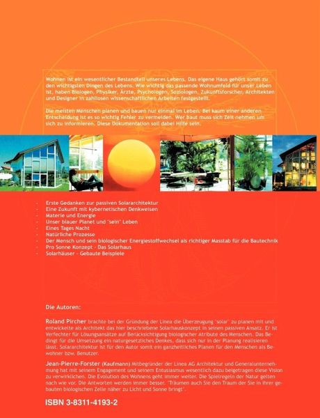 Die Lektüre dieses Buches soll in einfacher, für jedermann verständlichen und nachvollziehbaren Weise darstellen wie gesundheitsförderndes und naturbezogenes Bauen verwirklicht werden kann. Bewusst gemacht werden soll ein tieferes, übergreifendes Verständnis für die Lebensgrundlagen und der Funktionsweise der unser Leben bestimmenden Umwelt. In einem über die üblichen Bauaufgaben hinausgehenden interdisziplinären Denkprozess wird aufgezeigt mit welchen Mitteln man die Energie der Natur auf einfache und intelligente Weise für das eigene Wohlbefinden nützen und einspannen kann und damit ohne Mehrkosten eine Verbesserung der eigenen Lebensqualität erreicht. Das moderne Wohn- und Arbeitshaus, als seine Bewohner schützende und umgebende Hülle, in Form von Wänden und Decken mit verschiedenen, den jeweiligen Funktionen folgenden Eigenschaften, hat die Aufgabe - einer biologischen Zellmembran gleich - in einem ständigen, selektiven Prozess die Licht-, Energie- und Molekülflüsse aus der Umgebung aufnehmen welche notwendig sind um das Leben im Innern optimal zu schützen und Wohlbefinden zu erzeugen. Passive Solararchitektur setzt sich zum Ziel die Ausrichtung, die Gestaltung der Aussenflächen und der Grundrisse so zu wählen, dass die Gebäude dem inneren Energierhythmus und Energiefluss folgend, die notwendige Energie grösstenteils aus vorhandener Umweltwärme beziehen und speichern können. Solarhäuser werden zum Bestandteil des täglich wiederkehrenden und sich immer wieder schliessenden Kreises von Tag und Nacht, von Hell und Dunkel, von Aktivität und Ruhe. Grosszügige, auf den täglichen Lauf der Sonne hin orientierte, gut isolierende Glasflächen wandeln kurzwellige Licht-Strahlung in langwellige Wärme-Strahlung, sanfte elektronische Regeltechnik gewährleistet die Frischluftzufuhr im natürlich klimatisierten Gebäude. Ausgewählte Baustoffe speichern die Tageswärme in die Nachtstunden. Völlig in die Struktur des Solarhauses integrierte, begrünte Lichthöfe Sonnenstuben und Wintergärten verbessern Klima und Luftqualität nachhaltig. Die auf der jahrelang angesammelten Wissensbasis aufbauende, praktische Arbeit wird anhand von gebauten Beispielen dokumentiert. Gebaut wurde mit Bauherren die sich anfänglich für Solararchitektur interessierten, und sich aus dem, nach kritischer Auseinandersetzung mit den im Buch beschriebenen, natürlichen Vorgaben, resultierenden Denkprozess zum Bau eines solargerechten Hauses entschieden. Die gezeigten Beispiele wurden in den Jahren 1980 - 1990 gebaut.