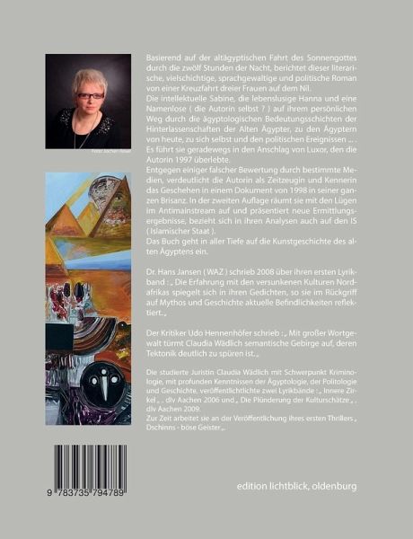 Basierend auf der altägyptischen Fahrt des Sonnengottes durch die zwölf Stunden der Nacht, berichtet dieser literarische, vielschichtige, sprachgewaltige und politische Roman von einer Kreuzfahrt dreier Frauen auf dem Nil.Die intellektuelle Sabine, die lebenslusige Hanna und eine Namenlose (die Autorin selbst?) auf ihrem persönlichen Weg durch die ägyptologischen Bedeutungsschichten der Hinterlassenschaften der Alten Ägypter, zu den Ägyptern von heute, zu sich selbst und den politischen Ereignissen ... .Es führt sie geradewegs in den Anschlag von Luxor, den die Autorin 1997 überlebte. Entgegen einiger falscher Bewertung durch bestimmte Medien, verdeutlicht die Autorin als Zeitzeugin und Kennerin das Geschehen in einem Dokument von 1998 in seiner ganzen Brisanz. In der zweiten Auflage räumt sie mit den Lügen im antimainstream auf und präsentiert neue Ermittlungsergebnisse, bezieht sich in ihren Analysen auch auf den IS (Islamischer Staat).Das Buch geht in aller Tiefe auf die Kunstgeschichte des alten Ägyptens ein.Dr. Hans Jansen (WAZ) schrieb 2008 über ihren ersten Lyrikband: "Die Erfahrung mit den versunkenen Kulturen Nordafrikas spiegelt sich in ihren Gedichten, so sie im Rückgriff auf Mythos und Geschichte aktuelle Befindlichkeiten reflektiert." Der Kritiker Udo Hennenhöfer schrieb: "Mit großer Wortgewalt türmt Claudia Wädlich semantische Gebirge auf, deren Tektonik deutlich zu spüren ist."