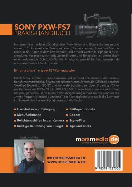 Mit rund 190 Seiten ist das Praxishandbuch FS7 zugleich Nachschlagewerk und praktische Anleitung für das Drehen mit der Sony PXW-FS7. Kameramann und -dozent Ulrich Mors gibt praktische Tipps zum Umgang und Einrichtung der Kamera und vermittelt tiefgehendes Wissen zum Thema S-Log und CINE Modus.Eine Übersicht über praktisches Zubehör von Fremdanbietern rundet das Praxishandbuch ab.Korrigierte zweite Auflage 2016.