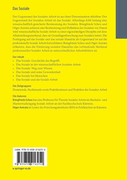 Der Gegenstand der Sozialen Arbeit ist aus ihrer Denomination ableitbar: Der Gegenstand der Sozialen Arbeit ist das Soziale. Allerdings fehlt bislang eine wissenschaftlich gesicherte Bestimmung des Sozialen. Bringfriede Scheu und Otger Autrata nehmen eine Bestimmung und Definition des Sozialen vor. Damit wird wissenschaftliche Soziale Arbeit zu einer eigenständigen Disziplin mit dem Alleinstellungsmerkmal, dass sie Grundlagenforschung zum Sozialen leistet. Die Festlegung auf das Soziale und das soziale Handeln als Gegenstand ist auf die professionelle Soziale Arbeit fortzuführen: Bringfriede Scheu und Otger Autrata erläutern, dass die Förderung sozialen Handelns das verbindende Merkmal professioneller Sozialer Arbeit in unterschiedlichen Arbeitsfeldern ist.