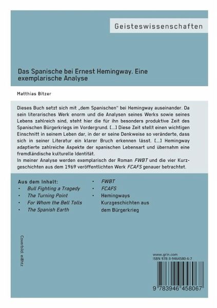 Diese Staatsarbeit setzt sich mit "dem Spanischen" bei Hemingway auseinander. Da sein literarisches Werk enorm und die Analysen seines Werks sowie seines Lebens zahlreich sind, wird hier nur die für ihn besonders produktive Zeit des Spanischen Bürgerkriegs im Vordergrund stehen.Diese Zeit stellt einen wichtigen Einschnitt in seinem Leben dar, in der er, durch die Einbindung in die spanische Sozialisation, fremde gesellschaftliche Werte annahm und seine Denkweise so veränderte, dass sich in seiner Literatur ein klarer Bruch erkennen lässt. Durch seine kulturelle Sozialisierung in den USA erkennt Hemingway in Spanien kulturspezifische Unterschiede und divergierende Bewertungsmaßstäbe wie sie Thomas unter dem Begriff "Kulturstandard" zusammenfasst. Hemingway adaptierte zahlreiche Aspekte der spanischen Lebensart und übernahm eine fremdländische kulturelle Identität. Dieser interkulturelle Austauschprozess führte möglicherweise dazu, dass der Autor nach der Niederlage der spanischen Republik nicht mehr außerhalb einer spanischsprachigen Region leben wollte und den fremden Kulturstandard bevorzugte. Besonders deutlich wird der Unterschied der beiden Kulturen im jeweiligen Umgang mit dem Tod (siehe Kapitel 4 und 14.2.). Nach meiner These prägten der Spanische Bürgerkrieg und "das Spanische" Hemingway persönlich und seine Literatur mehr als jedes andere Element.Aus dem Inhalt:- Bull Fighting a Tragedy- The Turning Point- Hemingways Kurzgeschichten aus dem Bürgerkrieg- For Whom the Bell Tolls- The Spanish Earth