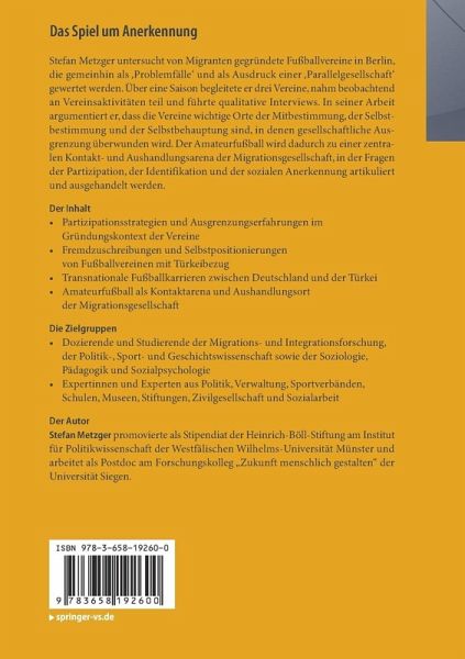 Stefan Metzger untersucht von Migranten gegründete Fußballvereine in Berlin, die gemeinhin als 'Problemfälle' und als Ausdruck einer 'Parallelgesellschaft' gewertet werden. Über eine Saison begleitete er drei Vereine, nahm beobachtend an Vereinsaktivitäten teil und führte qualitative Interviews. In seiner Arbeit argumentiert er, dass die Vereine wichtige Orte der Mitbestimmung, der Selbstbestimmung und der Selbstbehauptung sind, in denen gesellschaftliche Ausgrenzung überwunden wird. Der Amateurfußball wird dadurch zu einer zentralen Kontakt- und Aushandlungsarena der Migrationsgesellschaft, in der Fragen der Partizipation, der Identifikation und der sozialen Anerkennung artikuliert und ausgehandelt werden.