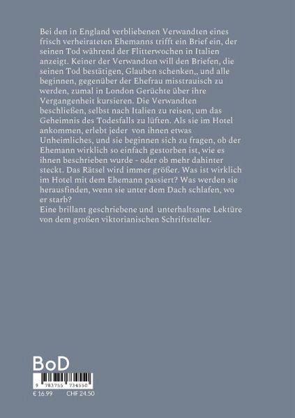 Bei den in England verbliebenen Verwandten eines frisch verheirateten Ehemanns trifft ein Brief ein, der seinen Tod während der Flitterwochen in Italien anzeigt. Keiner der Verwandten will den Briefen, die seinen Tod bestätigen, Glauben schenken, und alle beginnen, gegenüber der Ehefrau misstrauisch zu werden, zumal in London Gerüchte über ihre Vergangenheit kursieren. Die Verwandten beschließen, selbst nach Italien zu reisen, um das Geheimnis des Todesfalls zu lüften. Als sie im Hotel ankommen, erlebt jeder von ihnen etwas Unheimliches, und sie beginnen sich zu fragen, ob der Ehemann wirklich so einfach gestorben ist, wie es ihnen beschrieben wurde - oder ob mehr dahinter steckt. Das Rätsel wird immer größer. Was ist wirklich im Hotel mit dem Ehemann passiert? Was werden sie herausfinden, wenn sie unter dem Dach schlafen, wo er starb?Eine brillant geschriebene und unterhaltsame Lektüre von dem großen viktorianischen Schriftsteller.