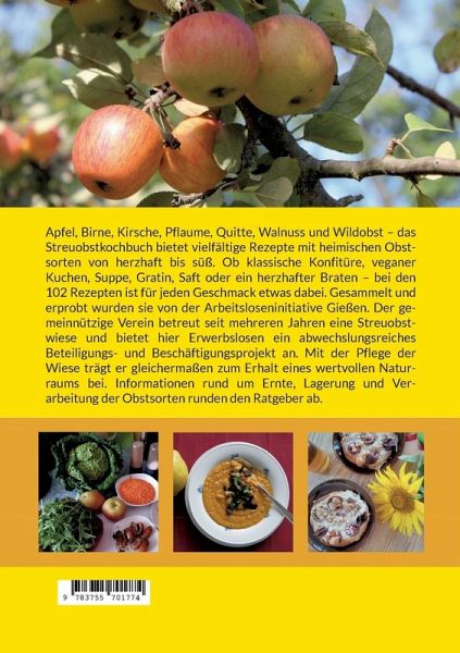 Das Streuobstkochbuch. Apfel, Birne, Kirsche, Pflaume, Quitte, Walnuss und Wildobst - das Streuobstkochbuch bietet vielfältige Rezepte mit heimischen Obstsorten von herzhaft bis süß. Ob klassische Konfitüre, veganer Kuchen, Suppe, Gratin, Saft oder ein herzhafter Braten - bei den 102 Rezepten ist für jeden Geschmack etwas dabei. Die Mehrzahl der Rezepte ist vegetarisch, viele sind vegan. Alle Rezepte sind mit Fotos versehen. Gesammelt und erprobt wurden sie von der Arbeitsloseninitiative Gießen. Der gemeinnützige Verein betreut seit mehreren Jahren eine Streuobstwiese und bietet hier Erwerbslosen ein abwechslungsreiches Beteiligungs- und Beschäftigungsprojekt an. Mit der Pflege der Wiese trägt er gleichermaßen zum Erhalt eines wertvollen Naturraums bei. Informationen rund um Ernte, Lagerung und Verarbeitung der Obstsorten runden den Ratgeber ab.
