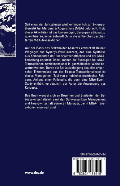 Auf der Basis des Stakeholder-Ansatzes entwickelt Helmut Wöginger ein Management-Tool, mit dem die Synergien bei Mergers & Acquisitions (M&A) unter Berücksichtigung von Ergebnissen der finanzwirtschaftlichen und M&A-Forschung in ganzheitlicher Weise bewertet werden können.