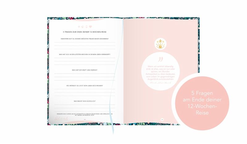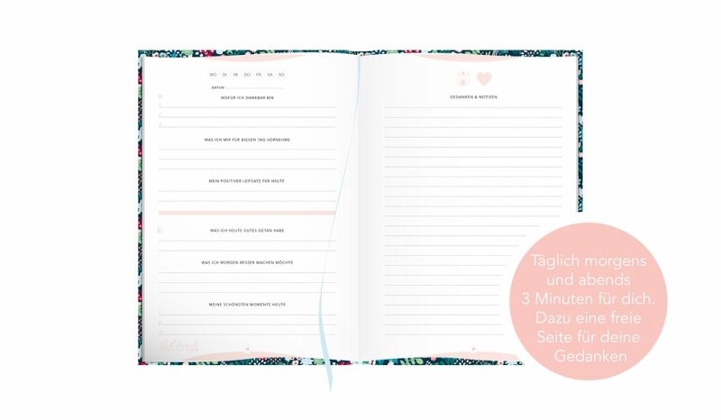 Kennst du das Geheimnis von glücklichen und erfolgreichen Menschen?"Glück beginnt in Dir" ist das Tagebuch, das dir dabei hilft positiver und glücklicher zu werden. Starte mit deinem neuen, kleinen 6 Minuten Ritual und du wirst merken, wie schnell du eine Veränderung spürst. Wofür bist du dankbar? Deine Familie, deine Arbeit oder der lustige Abend mit Freunden letztes Wochenende? Was hast du heute Gutes getan? Deiner Arbeitskollegin einen Kaffee mitgebracht, oder jemanden an der Kasse vorgelassen? Du hast jetzt die Chance dein Leben über die nächsten 12 Wochen/90 Tage zu reflektieren und deinen Fokus auf die positiven Dinge zu lenken.Special EditionDie Special Edition ist mit einem hochwertigen rosa-blau-gestreiften Leineneinband und Goldprägung versehen. Damit ist es das perfekte Geschenk zu jedem Anlass. Denn mehr Glück kann man ja immer gebrauchen!So funktioniert's!Für deine Tagebuch-Routine findest du im Buch morgens und abends drei vorgedruckte Denkanstöße. Sie wiederholen sich täglich und begleiten dich in den nächsten 12 Wochen. Wenn du möchtest, kannst du zusätzlich jeden Tag deine Gedanken aufschreiben. Nach jeder Woche hast du die Möglichkeit für deinen persönlichen Wochenrückblick. Außerdem bekommst du am Anfang und Ende Tagebuchs fünf Fragen gestellt. Damit kannst du dich auf die kommenden Wochen einstimmen und sie am Ende Revue passieren lassen.Dein Dankbarkeitstagebuch, Glückstagebuch, Tagebuch für mehr Achtsamkeit. Starte jetzt deine Reise ins Glück!Produktdetails- hochwertiger Hardcover Leinen-Einband in blau/rosa mit Goldprägung- mit praktischem Leseband- Format: DIN A5 (148x210 mm)- 200 Seiten hochwertiges Papier zum einfachen Beschreiben- Jeweils 5 Fragen zu Beginn und Ende der 12 Wochen- 6 tägliche Denkanstöße (3 morgens, 3 abends)- Notizseite für jeden Tag- Notizseite nach jeder WocheEinprägsames und unverwechselbares Design sowie hochwertige Materialien von Stay Inspired! by Lisa Wirth.