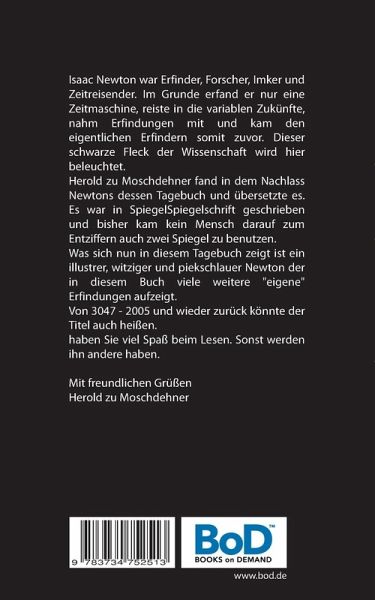 Isaac Newton war Erfinder, Forscher, Imker und Zeitreisender. Im Grunde erfand er nur eine Zeitmaschine, reiste in die variablen Zukünfte, nahm Erfindungen mit und kam den eigentlichen Erfindern somit zuvor. Dieser schwarze Fleck der Wissenschaft wird hier beleuchtet.Herold zu Moschdehner fand in dem Nachlass Newtons dessen Tagebuch und übersetzte es. Es war in SpiegelSpiegelschrift geschrieben und bisher kam kein Mensch darauf zum Entziffern auch zwei Spiegel zu benutzen. Was sich nun in diesem Tagebuch zeigt ist ein illustrer, witziger und piekschlauer Newton der in diesem Buch viele weitere "eigene" Erfindungen aufzeigt. Von 3047 - 2005 und wieder zurück könnte der Titel auch heißen. Haben Sie viel Spaß beim Lesen. Sonst werden ihn andere haben. Mit freundlichen GrüßenHerold zu Moschdehner
