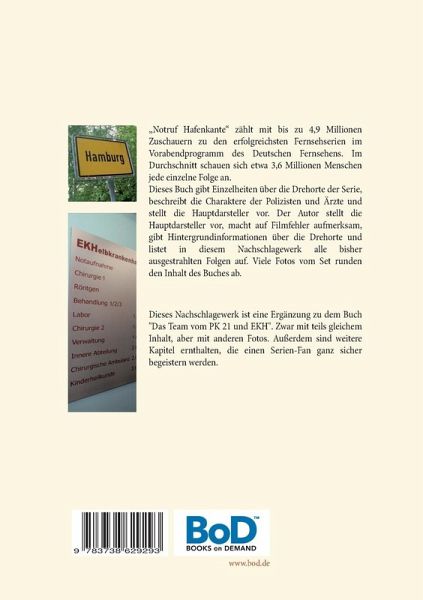 "Notruf Hafenkante" zählt mit bis zu 4,9 Millionen Zuschauern zu den erfolgreichsten Fernsehserien im Vorabendprogramm des Deutschen Fernsehens. Im Durchschnitt schauen sich etwa 3,6 Millionen Menschen jede einzelne Folge an. Von 2007 bis 2015 wurden bereits 217 Episoden ausgestrahlt. "Notruf Hafenkante" ist eine Serie über den Berufsalltag Hamburger Streifenpolizisten und Notärzten, eingebettet mit netten Geschichten Hamburger Bürger. Das Polizeikommissariat 21 liegt direkt an der Hafenkante. Dabei handelt es sich um eine Uferlinie, die an Neumühlen beginnt, den St. Pauli Landungsbrücken vorbeiführt und bis zur Speicherstadt und der neuen Hafen-City reicht. Das Buch gibt Einzelheiten über die Drehorte der Serie, beschreibt die Charaktere der Polizisten und Ärzte und stellt die Hauptdarsteller vor. Natürlich sind auch berühmte Gastdarsteller berücksichtigt: so standen schon Sky du Mont, Heide Keller, Uwe Friedrichsen, Wayne Carpendale,, Renate Delfs oder beispielsweise Edgar Bessem vor der Kamera und wirkten in einzelnen Folgen mit. Der Autor stellt die Hauptdarsteller vor, macht auf Filmfehler aufmerksam, gibt Hintergrundinformationen über die Drehorte und listet in diesem Nachschlagewerk alle bisher ausgestrahlten Folgen auf. Viele Fotos vom Set runden den Inhalt des Buches ab.Dieses Nachschlagewerk ist eine Ergänzung zu dem Buch "Das Team vom PK 21 und EKH" - zwar mit teils gleichem Inhalt, aber mit anderen Fotos. Außerdem sind weitere Kapitel enthalten, die einen Serien-Fan ganz sicher begeistern werden.