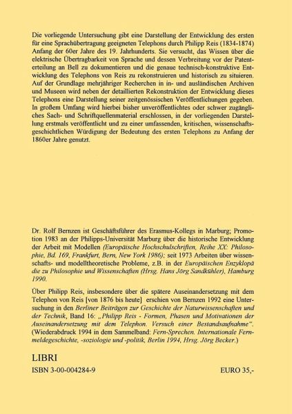 Die vorliegende Untersuchung gibt eine detaillierte Darstellung der Entwicklung des ersten für eine Sprachübertragung geeigneten Telephons durch Philipp Reis (1834-1874) Anfang der 60er Jahre des 19. Jahrhunderts. Sie dokumentiert das Wissen über die elektrische Übertragbarkeit von Sprache und dessen Verbreitung vor der Patenterteilung an Alexander Graham Bell (1876) in den USA. Gleichzeitig rekonstruiert sie die genaue technisch-konstruktive Entwicklung des Telephons von Reis und ordnet diese wissenschaftshistorisch ein. Auf der Grundlage mehrjähriger Recherchen in in- und ausländischen Archiven und Museen wird neben der detaillierten Rekonstruktion der Entwicklung dieses Telephons eine Darstellung seiner zeitgenössischen Veröffentlichung gegeben. In großem Umfang wird hierbei bisher unveröffentlichtes oder schwer zugängliches Sach- und Schriftquellenmaterial erschlossen, in der vorliegenden Darstellung erstmals veröffentlicht und zu einer umfassenden, kritischen, wissenschaftsgeschichtlichen Würdigung der Bedeutung des ersten Telephons genutzt.