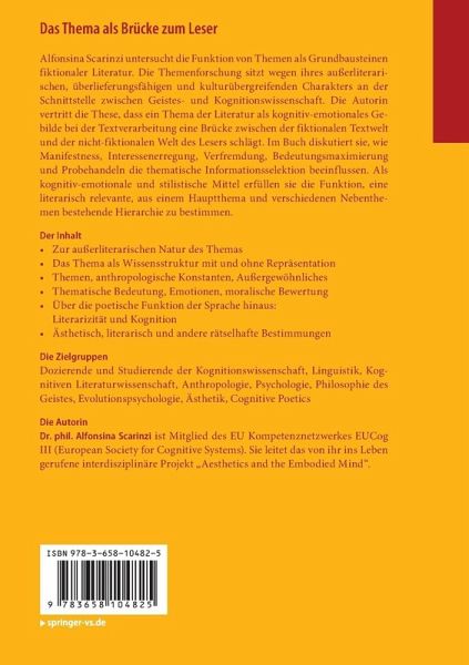 Alfonsina Scarinzi untersucht die Funktion von Themen als Grundbausteine fiktionaler Literatur. Die Themenforschung sitzt wegen ihres außerliterarischen, überlieferungsfähigen und kulturübergreifenden Charakters an der Schnittstelle zwischen Geistes- und Kognitionswissenschaft. Die Autorin vertritt die These, dass ein Thema der Literatur als kognitiv-emotionales Gebilde bei der Textverarbeitung eine Brücke zwischen der fiktionalen Textwelt und der nicht-fiktionalen Welt des Lesers schlägt. Im Buch diskutiert sie, wie Manifestness, Interessenerregung, Verfremdung, Bedeutungsmaximierung und Probehandeln die thematische Informationsselektion beeinflussen. Als kognitiv-emotionale und stilistische Mittel erfüllen sie die Funktion, eine literarisch relevante, aus einem Hauptthema und verschiedenen Nebenthemen bestehende Hierarchie zu bestimmen.