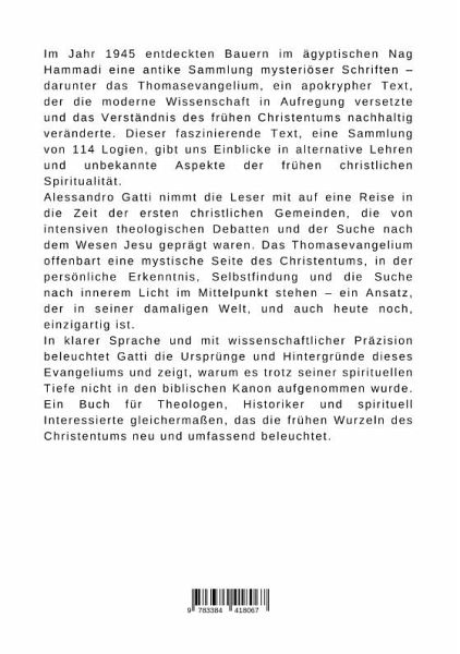 Im Jahr 1945 entdeckten Bauern im ägyptischen Nag Hammadi eine antike Sammlung mysteriöser Schriften - darunter das Thomasevangelium, ein apokrypher Text, der die moderne Wissenschaft in Aufregung versetzte und das Verständnis des frühen Christentums nachhaltig veränderte. Dieser faszinierende Text, eine Sammlung von 114 Logien, gibt uns Einblicke in alternative Lehren und unbekannte Aspekte der frühen christlichen Spiritualität.Alessandro Gatti nimmt die Leser mit auf eine Reise in die Zeit der ersten christlichen Gemeinden, die von intensiven theologischen Debatten und der Suche nach dem Wesen Jesu geprägt waren. Das Thomasevangelium offenbart eine mystische Seite des Christentums, in der persönliche Erkenntnis, Selbstfindung und die Suche nach innerem Licht im Mittelpunkt stehen - ein Ansatz, der in seiner damaligen Welt, und auch heute noch, einzigartig ist.In klarer Sprache und mit wissenschaftlicher Präzision beleuchtet Gatti die Ursprünge und Hintergründe dieses Evangeliums und zeigt, warum es trotz seiner spirituellen Tiefe nicht in den biblischen Kanon aufgenommen wurde. Ein Buch für Theologen, Historiker und spirituell Interessierte gleichermaßen, das die frühen Wurzeln des Christentums neu und umfassend beleuchtet.