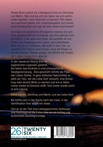 "Das Tintenfass Sophia oder die Kugeln des Lieben Gottes" erzählt die Liebesgeschichte von Dorothea und Martin. Wer sind sie und wie haben sie sich aufeinander zugelebt, noch ohne sich zu kennen? Wie haben sie zusammengelebt, sich zusammengelebt und wieder auseinander gelebt und was hat alles dieses beeinflusst? Und das sind persönliche Divergenzen ebenso wie politisch-gesellschaftliche Umstände. Ihre Ehe befindet sich schließlich in der absoluten Krise. Sie schaffen es und finden zum Ausgangspunkt zurück; der Liebesheirat. Wem ist das zu verdanken, das steht in dem Text, so reduziert wie mögich geschrieben, ohne die Poesie zu vernachlässigen, besser gesagt,nur mithilfe der Poesie geht diese präzise Verknappung.In den narraiven Strang sind die so genannten Legenden gebettet. Sie heben das Konkrete in eine philosophische Verallgemeinerung. Dies geschieht mithilfe der Figur des Lieben Gottes. In ganz einfachen Geschichten erzählt der Text, wie der Liebe Gott versucht, eine Schöpfung nach seinem Bild zu machen und wie er dabei immer wieder an seine Grenzen stößt.Und immer wieder sucht er eine Lösug. Beide suchen, Dorothea und Martin und der Liebe Gott. Sie treffen sich in der Suche nach der Liebe,in der Identifikation mit dieser.Und so ist diese Text eine Liebesgeschichte überhaupt, eine Hommage an die Liebe über sie als Auftrag und essentielle Daseinsgrundlage.