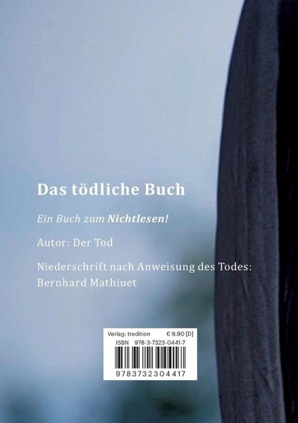 Der Tod erfindet dieses Buch, um seine Opfer auf einem neuen Weg holen zu können. Wer sich, nach einer anfänglichen Warnung, zum Lesen des Buches verleiten lässt, wird unweigerlich sterben. Einmal angesteckt , gibt es kein Zurück, der Leser beginnt seine Agonie zu erleben. Die Menschen von der Perspektive des unerbittlichen, kalten und oft gemeinen Todes aus gesehen, welcher aber auch seine Schwäche und seinen Neid auf die Menschen zeigt.