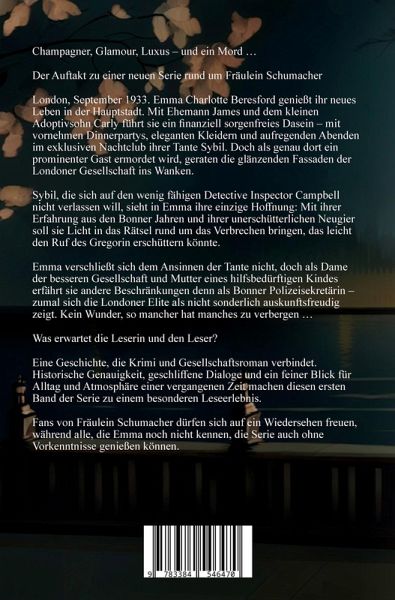 Champagner, Glamour, Luxus - und ein Mord ...Der Auftakt zu einer neuen Serie rund um Fräulein SchumacherLondon, September 1933. Emma Charlotte Beresford genießt ihr neues Leben in der Hauptstadt. Mit Ehemann James und dem kleinen Adoptivsohn Carly führt sie ein finanziell sorgenfreies Dasein - mit vornehmen Dinnerpartys, eleganten Kleidern und aufregenden Abenden im exklusiven Nachtclub ihrer Tante Sybil. Doch als genau dort ein prominenter Gast ermordet wird, geraten die glänzenden Fassaden der Londoner Gesellschaft ins Wanken.Sybil, die sich auf den wenig fähigen Detective Inspector Campbell nicht verlassen will, sieht in Emma ihre einzige Hoffnung: Mit ihrer Erfahrung aus den Bonner Jahren und ihrer unerschütterlichen Neugier soll sie Licht in das Rätsel rund um das Verbrechen bringen, das leicht den Ruf des Gregorin erschüttern könnte.Emma verschließt sich dem Ansinnen der Tante nicht, doch als Dame der besseren Gesellschaft und Mutter eines hilfsbedürftigen Kindes erfährt sie andere Beschränkungen denn als Bonner Polizeisekretärin - zumal sich die Londoner Elite als nicht sonderlich auskunftsfreudig zeigt. Kein Wunder, so mancher hat manches zu verbergen ...Was erwartet die Leserin und den Leser?Eine Geschichte, die Krimi und Gesellschaftsroman verbindet. Historische Genauigkeit, geschliffene Dialoge und ein feiner Blick für Alltag und Atmosphäre einer vergangenen Zeit machen diesen ersten Band der Serie zu einem besonderen Leseerlebnis.Fans von Fräulein Schumacher dürfen sich auf ein Wiedersehen freuen, während alle, die Emma noch nicht kennen, die Serie auch ohne Vorkenntnisse genießen können.