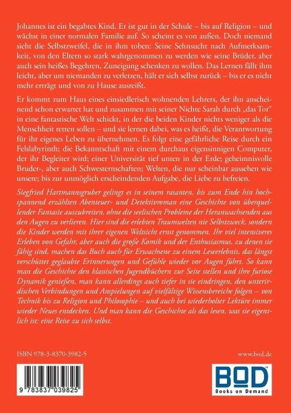 Johannes ist ein begabtes Kind. Er ist gut in der Schule - bis auf Religion - und wächst in einer normalen Familie auf. So scheint es von außen. Doch niemand sieht die Selbstzweifel, die in ihm toben: Seine Sehnsucht nach Aufmerksamkeit, von den Eltern so stark wahrgenommen zu werden wie seine Brüder, aber auch sein heißes Begehren, Zuneigung schenken zu wollen. Das Lernen fällt ihm leicht, aber um niemanden zu verletzen, hält er sich selbst zurück - bis er es nicht mehr erträgt und von zu Hause ausreißt. Er kommt zum Haus eines einsiedlerisch wohnenden Lehrers, der ihn anscheinend schon erwartet hat und zusammen mit seiner Nichte Sarah durch "das Tor" in eine fantastische Welt schickt, in der die beiden Kinder nichts weniger als die Menschheit retten sollen - und sie lernen dabei, was es heißt, die Verantwortung für ihr eigenes Leben zu übernehmen. Es folgt eine gefährliche Reise durch ein Felslabyrinth; die Bekanntschaft mit einem durchaus eigensinnigen Computer, der ihr Begleiter wird; einer Universität tief unten in der Erde; geheimnisvolle Bruder-, aber auch Schwesternschaften; Welten, die nur scheinbar aussehen wie unsere; bis zur unmöglich erscheindenden Aufgabe, die Liebe zu befreien. Siegfried Hartmannsgruber gelingt es in seinem rasanten, bis zum Ende hin hochspannend erzählten Abenteuer- und Detektivroman eine Geschichte von überquellender Fantasie auszubreiten, ohne die seelischen Probleme der Heranwachsenden aus den Augen zu verlieren. Hier sind die erlebten Traumwelten nie Selbstzweck, sondern die Kinder werden mit ihrer eigenen Weltsicht ernst genommen. Ihr viel intensiveres Erleben von Gefahr, aber auch die große Komik und der Enthusiasmus, zu denen sie fähig sind, machen das Buch auch für Erwachsene zu einem Leseerlebnis, das längst verschüttet geglaubte Erinnerungen und Gefühle wieder vor Augen führt. So kann man die Geschichte den klassischen Jugendbüchern zur Seite stellen und ihre furiose Dynamik genießen, man kann allerdings auch tiefer in sie eindringen, den unterirdischen Verbindungen und Anspielungen auf vielfältige Wissensbereiche folgen - von Technik bis zu Religion und Philosophie - und auch bei wiederholter Lektüre immer wieder Neues entdecken. Und man kann die Geschichte als das lesen, was sie eigentlich ist: eine Reise zu sich selbst.