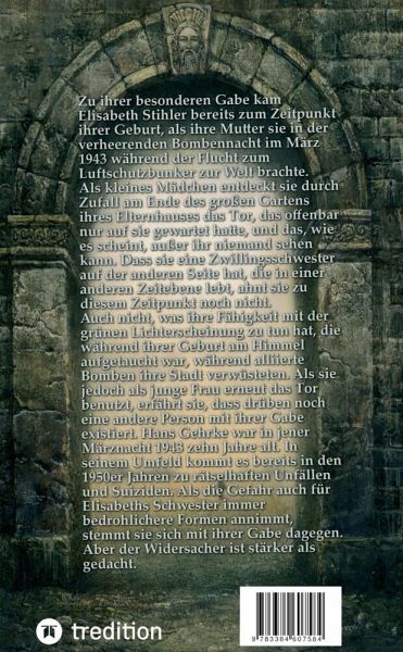 Zu ihrer besonderen Gabe kam Elisabeth Stihler bereits zum Zeitpunkt ihrer Geburt, als ihre Mutter sie in der verheerenden Bombennacht im März 1943 während der Flucht zum Luftschutzbunker zur Welt brachte. Als kleines Mädchen entdeckt sie durch Zufall am Ende des großen Gartens ihres Elternhauses das Tor, das offenbar nur auf sie gewartet hatte, und das, wie es scheint, außer ihr niemand sehen kann. Dass sie eine Zwillingsschwester auf der anderen Seite hat, die in einer anderen Zeitebene lebt, ahnt sie zu diesem Zeitpunkt noch nicht. Auch nicht, was ihre Fähigkeit mit der grünen Lichterscheinung zu tun hat, die während ihrer Geburt am Himmel aufgetaucht war, während alliierte Bomben ihre Stadt verwüsteten. Als sie jedoch als junge Frau erneut das Tor benutzt, erfährt sie, dass drüben noch eine andere Person mit ihrer Gabe existiert. Hans Gehrke war in jener Märznacht 1943 zehn Jahre alt. In seinem Umfeld kommt es bereits in den 1950er Jahren zu rätselhaften Unfällen und Suiziden. Als die Gefahr auch für Elisabeths Schwester immer bedrohlichere Formen annimmt, stemmt sie sich mit ihrer Gabe dagegen. Aber der Widersacher ist stärker als gedacht.