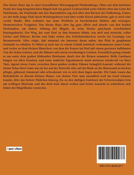Das kleine Haus lag in einer freundlichen Wiesengegend Württembergs. Oben auf dem höchsten Punkt des lang hingestreckten Hügels hob ein graues Grafenschloß seine Dächer über das Grün der Parkbäume, die Dorfstraße mit den Bauernhöfen zog sich über den Rücken der Erdhebung. Unten, wo der helle junge Fluß durch Weidengebüsch und über weiße Kiesel plätscherte, gab es noch eine zweite Straße. Hier wohnten nur arme Weiblein in bescheidenen Hütten, mit winzigen, blumenreichen Vorgärten. Das kleine Haus aber lag ganz allein und abseits von den beiden Dorfstraßen, am linken Abhang des Hügels, in seine Flanke gleichsam verschüchtert hineingedrückt. Der Weg, der vom Dorf zu ihm hinunter führte, war steil und steinicht, voller Löcher und Pfützen. Rechts und links neben den Schlehdornhecken wuchs ein Gestrüpp von Brennnesseln. Alles zeigte, daß niemand ein Interesse daran nahm, den Pfad in gangbarem Zustande zu erhalten. Er führte ja auch nur zu einem Gehöft notorisch verkommener armer Leute, und weiter zu dem kleinen Häuschen, von dem die Frauen im Dorf mit einem gewissen halblauten Ton der Scheu redeten, und die Männer mit einem zweideutigen Grinsen. Freundlich genug schaute es aus unter dem großen blühenden Birnbaum, durch den die Bienen summten. Helle Gardinen hingen vor allen Fenstern, und seine stattliche Eigentümerin stand meistens würdevoll vor ihrer Türe, irgend etwas Gutes zwischen ihren großen weißen Zähnen behaglich kauend, während die kleine Schar ihrer Gäste um sie her auf der Schwelle oder auf der Bank an der Hauswand zu hocken pflegte, gähnend, träumend oder schwatzend, wie es sich eben fügen mochte. Die Gäste waren das Bedenkliche in diesem kleinen Hause, von dessen Türe man unendlich weit ins Land schauen konnte, über das heitere Flüßchen hinweg, bis zu den duftigen Umrissen der Schweizeralpen fern am wolkigen Horizont, und das doch trotz dieser weiten und freien Aussicht so schüchtern sich hinter der Hügelflanke versteckte.