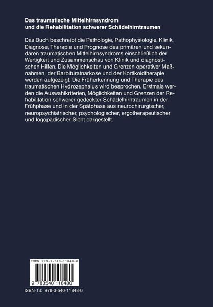 Der pontomedulläre Einriß - Isoliertes primäres Hirnstammtrauma durch Hyperextension der HWS.- Verlaufsformen und Prognose akuter Hirnstammsyndrome.- Pathophysiologie des Schädelhirntraumas - Neue Erkenntnisse zum traumatischen Hirnödem.- Prognose traumatischer Mittelhirnsyndrome bei Kindern und Jugendlichen.- Zur Problematik von Anisokorie und OperationsZeitpunkt beim schwer Schädelhirn- verletzten.- Computertomographie bei schweren Schädelhirnverletzungen.- Computertomographische Befunde bei Kindern mit traumatischem Mittelhirnsyndrom.- Zeichen der Mittelhirnschädigung im Computertomogramm und Hirnschnitten nach Schädelhirntrauma.- Zum Problem der Zisternenverquellung und direkter sowie sekundärer Schädigungen am Hirnstamm (Computertomographische Analysen).- Klinische und computertomographische Spätergebnisse nach operativer Therapie posttraumatischer Liquorzirkulationsstörungen.- Traumatisches Mittelhirnsyndrom: Differentialdiagnose primärer/sekundärer Hirnstammschäden, Prognose und intrakranieller Druck.- Messung des intrakraniellen Druckes bei verschiedenen Stadien des Mittelhirnsyndroms.- Electroencephalographische Befunde und Frequenzanalysen beim traumatisch bedingten Mittelhirnsyndrom.- Toposelektive EEG-Ableitungen und ihre Bedeutung für die Diagnose von Hirnsubstanzschäden.- Die diagnostische Wertigkeit der frühen akustisch evozierten Potentiale beim Koma mit Mittelhirnsymptomatik.- Operative Maßnahmen beim akuten Mittelhirnsyndrom nach Trauma.- Therapie des posttraumatischen Hydrocephalus.- Zur Problematik des posttraumatischen Hydrocephalus.- Thiopentaltherapie bei Patienten im akuten Mittelhirnsyndrom.- Etomidat in der Behandlung des Mittelhirnsyndroms bei schwerem Schädelhirntrauma.- Dexamethason beim traumatischenMittelhirnsyndrom.- Zur Behandlung des traumatischen Mittelhirnsyndroms durch die hyperbare Oxygenierung.- Die langdauernde Anwendung des Cava-Katheters und ihre Komplikationen bei schweren Schädelhirntraumen.- Probleme der Langzeiternährung bei schweren Schädelhirnverletzungen.- Überlegungen zur Behandlung von Spätfolgen schwerer Hirnverletzungen.- Sinn und Unsinn medikamentöser Behandlung posttraumatischer cerebraler Spätschäden.- Zur Prognose der posttraumatischen Temporallappenepilepsie.- Diagnostik und Therapie des Hemineglect-Syndroms.- Zur Differentialtherapie des posttraumatischen Schwindels.- Sport mit Hirnverletzten, insbesondere beim Auftreten organisch-cerebraler Anfälle.- Krankengymnastische Aspekte bei der Behandlung von Schädelhirnverletzten.- Ergotherapie zwischen Klinik und Beruf.- Möglichkeiten der operativen Therapie aus orthopädischer Sicht.- Grenzen der Rehabilitation bei schweren gedeckten Schädelhirntraumen in der Frühphase aus der Sicht des Neurochirurgen.- Probleme der Prognose und Langzeitrehabilitation nach schweren gedeckten Schädelhirntraumen.- Aphasietherapie schwer Hirngeschädigter.- Die integrierte Behandlung und Nachsorge Unfallverletzter mit multiplen Verletzungen und gleichzeitigem Schädelhirntrauma.- Die interdisziplinäre Nachsorge sog. verspäteter Fälle von schwer Hirnverletzten und Polytraumatisierten mit gleichzeitiger schwerer Schädelhirnverletzung.- Auswahlkriterien der stationären medizinischen Rehabilitation schwer Schädelhirnverletzter.- Der Wiederaufbau der Sprechfunktion nach traumatisch bedingtem Mutismus.