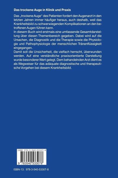 Das "trockene Auge" des Patienten fordert den Augenarzt in den letzten Jahren immer häufiger heraus, auch deshalb, weil das Krankheitsbild zu schwerwiegenden Komplikationen am betroffenen Auge führen kann. In diesem Buch wird erstmals eine umfassende Gesamtdarstellung über diesen Themenbereich gegeben. Dabei wird auf die Ursachen, die Diagnostik und die Therapie sowie die Physiologie und Pathophysiologie der menschlichen Tränenflüssigkeit eingegangen. Damit soll die Unsicherheit, die vielfach herrscht, überwunden werden. Auf eine verständliche, praxisorientierte Darstellung wurde besonderer Wert gelegt. Dem behandelnden Arzt dient es als Wegweiser für das adäquate diagnostische und therapeutische Vorgehen bei diesem Krankheitsbild.