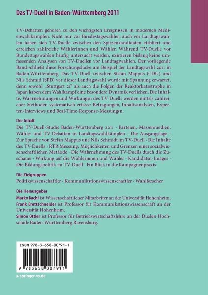 TV-Debatten gehören zu den wichtigsten Ereignissen in modernen Medienwahlkämpfen. Nicht nur vor Bundestagswahlen, auch vor Landtagswahlen haben sich TV-Duelle zwischen den Spitzenkandidaten etabliert und erreichen zahlreiche Wählerinnen und Wähler. Während TV-Duelle vor Bundestagswahlen häufig untersucht werden, existieren bislang keine umfassenden Analysen von TV-Duellen vor Landtagswahlen. Dieser Band schließt die Forschungslücke am Beispiel der Landtagswahl 2011 in Baden-Württemberg. Das TV-Duell zwischen Stefan Mappus (CDU) und Nils Schmid (SPD) vor dieser Landtagswahl wurde mit Spannung erwartet, denn sowohl "Stuttgart 21" als auch die Folgen der Reaktorkatastrophe in Japan haben dem Wahlkampf eine besondere Dynamik verliehen. Die Inhalte, Wahrnehmungen und Wirkungen des TV-Duells werden mittels zahlreicher Methoden systematisch erfasst: Befragungen, Inhaltsanalysen, Experten-Interviews und Real-Time-Response-Messungen.